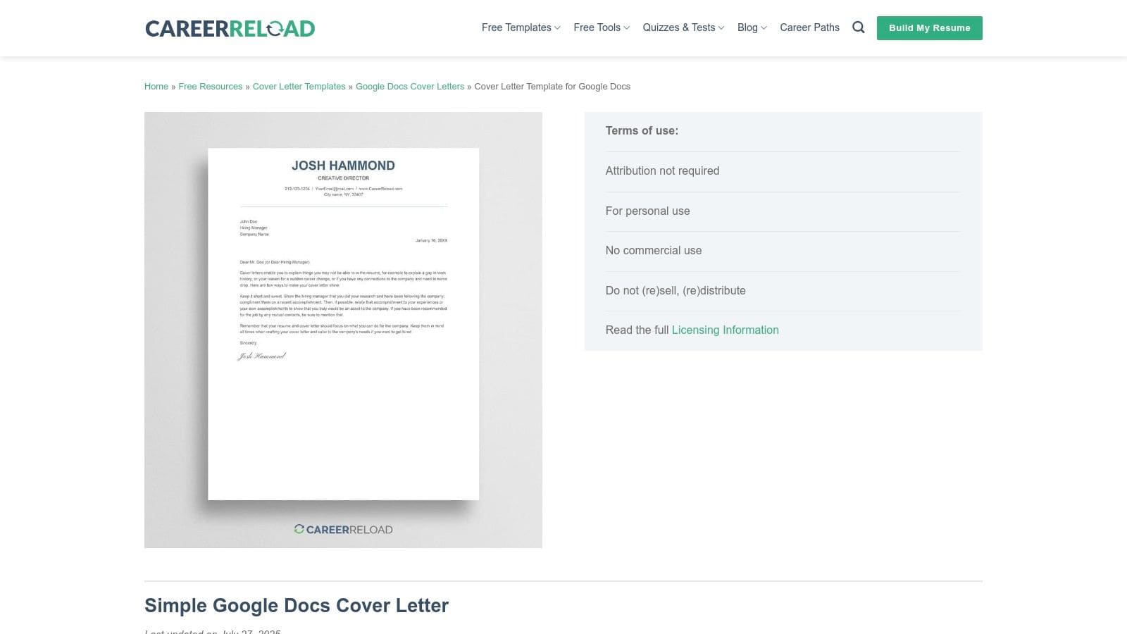 7. Career Reload – Simple Google Docs Cover Letter Template