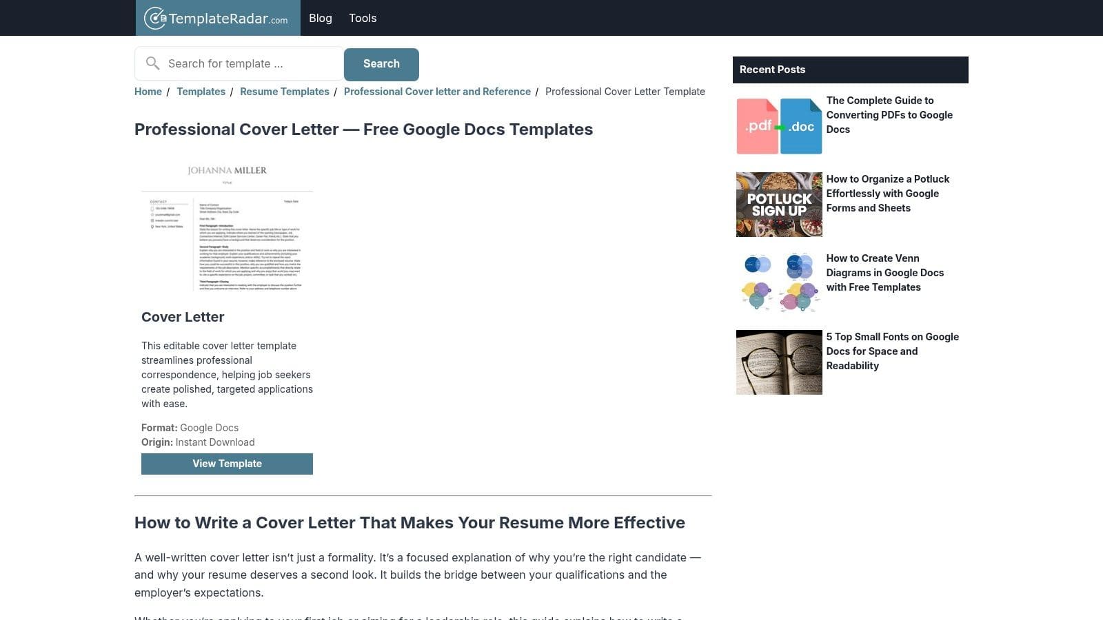 TemplateRadar offers a focused resource for job seekers who want more than just a file download. Instead of a large gallery, it provides a single, effective professional Google Docs templates cover letter paired with concise writing guidance directly on the page. This approach is perfect for individuals who value simplicity and actionable advice, helping them understand not just what to write, but why it works. It combines the template with a mini-tutorial, making it an excellent all-in-one stop.