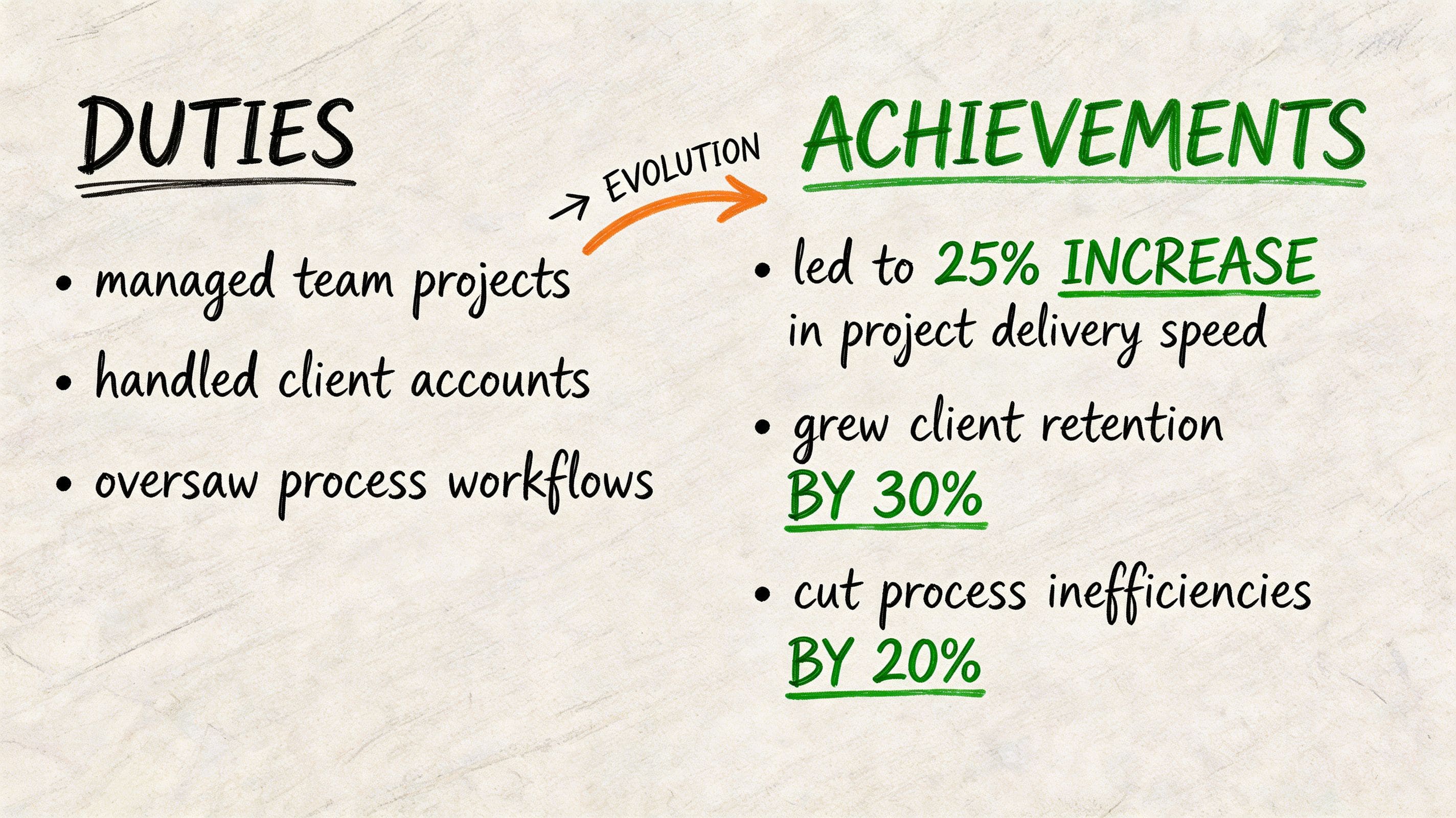 The biggest upgrade you can make is simple. Replace passive duty statements with achievement statements.