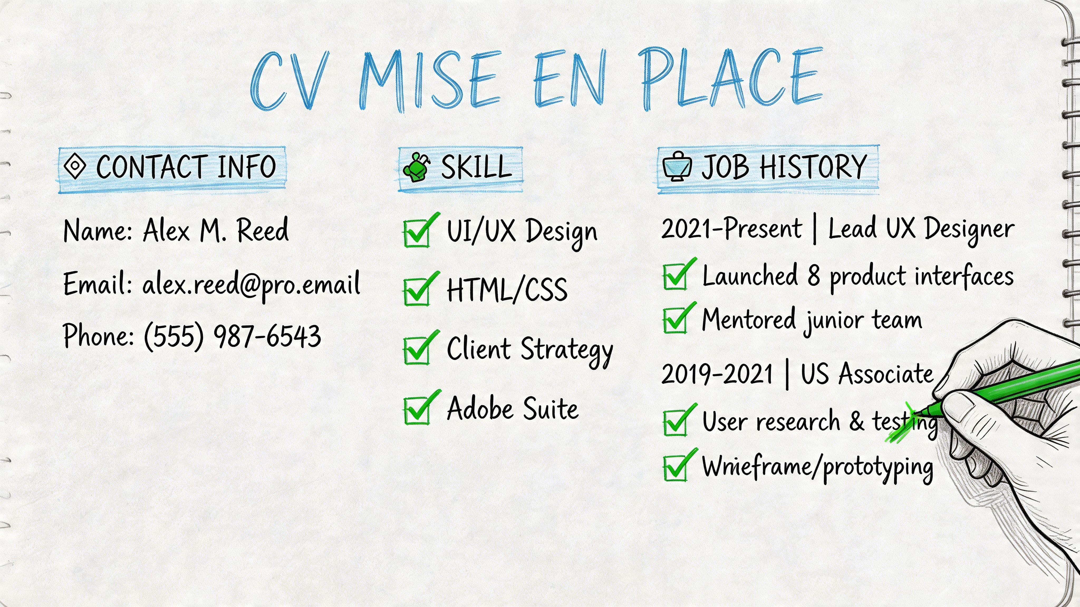 - Contact details. Full name, phone number, professional email, LinkedIn URL, town or city.