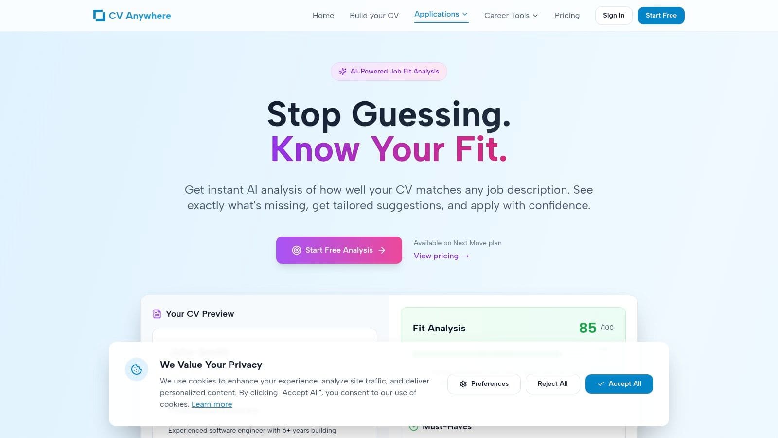 If you want a faster way to move from "review my CV" to a customised application, CV Anywhere brings CV building, job-description matching, and application tracking into one workflow so you can check fit, refine the document, and keep your search organised.